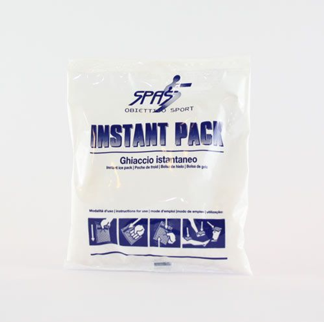 Impacco freddo usa e getta. Il sacchetto è a doppio strato in polietilene. Modo d’uso: Dopo aver premuto la bolla contenuta all’interno del sacchetto, si sviluppa immediatamente un processo di raffreddamento istantaneo (-4°C).Agitare per miscelare il contenuto.